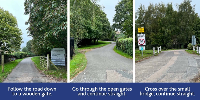 Bradbourne Lane will bend round to the left. On the bend is a right turning with a sign for The Bradbourne Osteopathic Practice and East Malling Trust Estate. Turn right here.